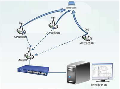 在覆盖无线局域网的地方,佩戴在人员身上的定位卡或腕带周期性地发出信号,无线局域网访问点(AP)接收到信号后,将信号传送给定位服务器。定位服务器根据信号的强弱或信号到达时差判断出人员的位置,并通过电子地图显示具体位置。