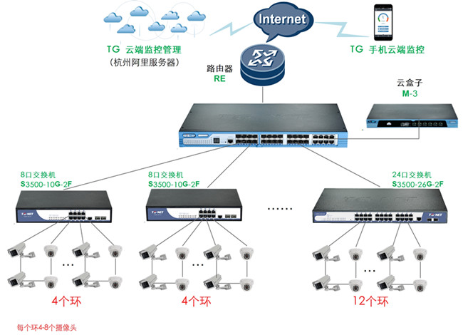 采用TG-NET千兆接入型交换机S3500系列,使用安防监控下行多环技术。【如下拓扑图】